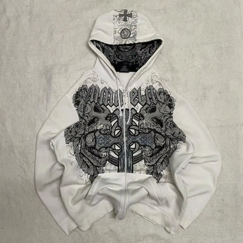 جاكيت رجالي روك قوطي، سترة بغطاء رأس مطرزة برسومات، ملابس Y2K، هاراجوكو، هيب هوب، ريترو، بسحاب، سترة واسعة -